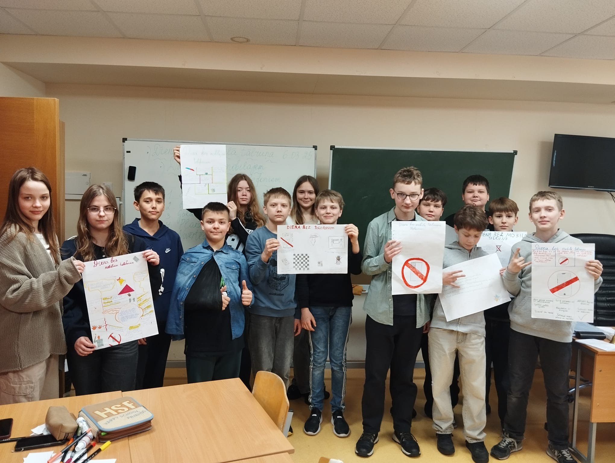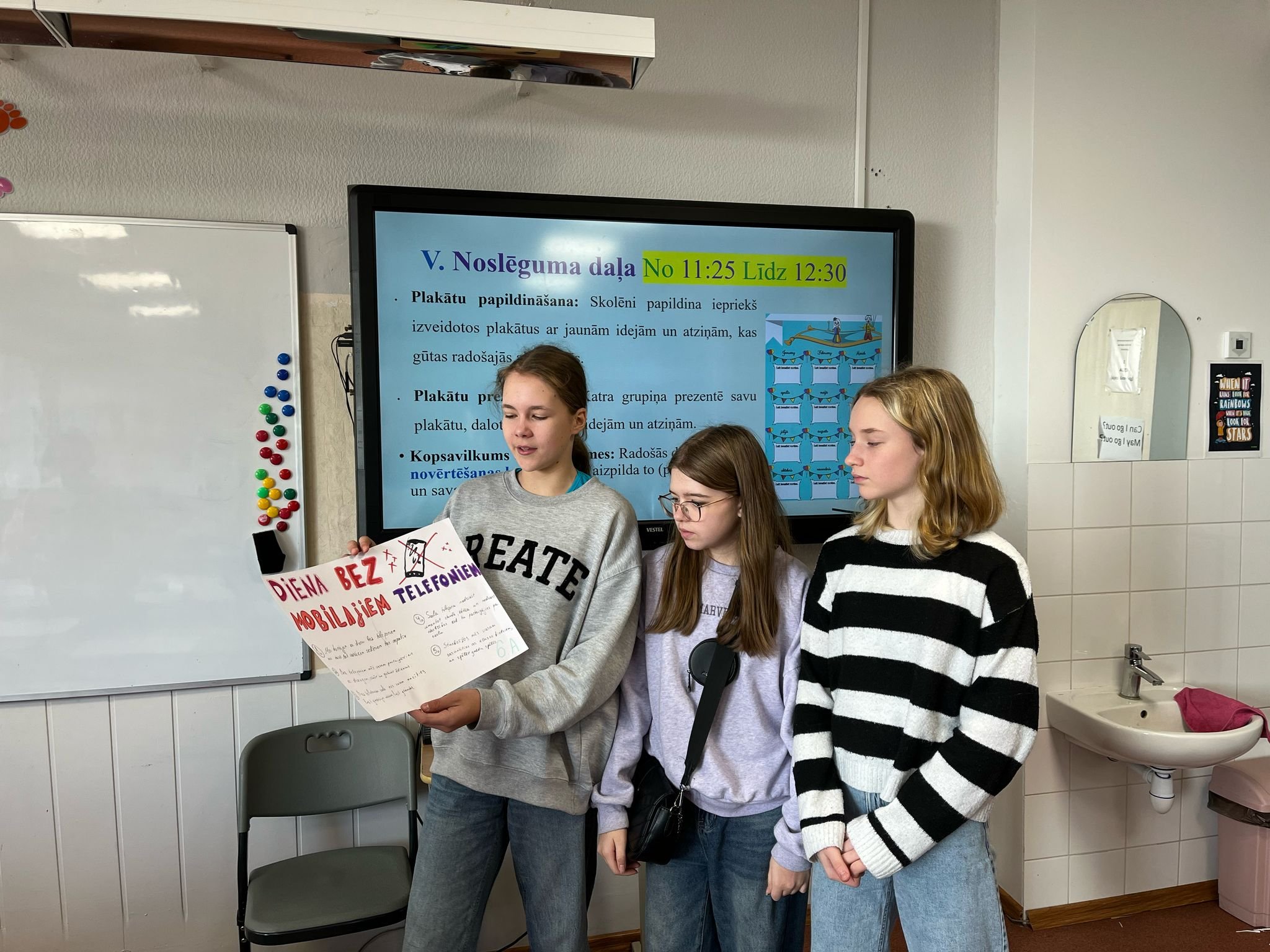 Diena sākās ar kopīgu ievaddaļu, kurā skolēni grupās veidoja plakātus par tēmu "Skola bez mobilajiem telefoniem". Plakātos tika iekļauti kārtības noteikumi, idejas par jēgpilnu starpbrīžu pavadīšanu un citi radoši risinājumi.